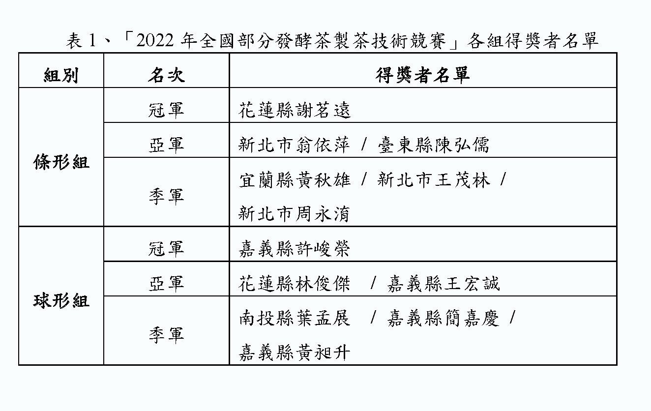 2022年全國部分發酵茶製茶技術競賽於9月6、7日兩天在行政院農業委員會茶業改良場總場辦理,由全台各縣市計39位製茶好手同台競技,此次競賽分條形包種茶及清香型球形烏龍茶分兩組進進行競賽,統一採用臺茶12號(龍潭茶區機採茶菁)茶菁,讓參賽選手在相同的製茶環境和條件下,於取得茶菁後,隨即依據自身累積的製茶經驗及當下的氣候狀況去斟酌與判斷萎凋、殺菁、揉捻、乾燥的每個製茶步驟的時間和程度,以傳統純手工方式製茶,這需要專注且不眠不休地關注茶菁到茶乾的變化。